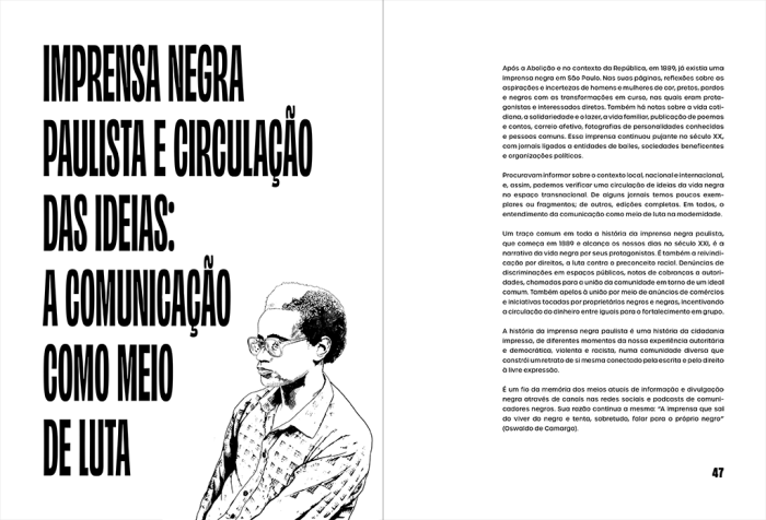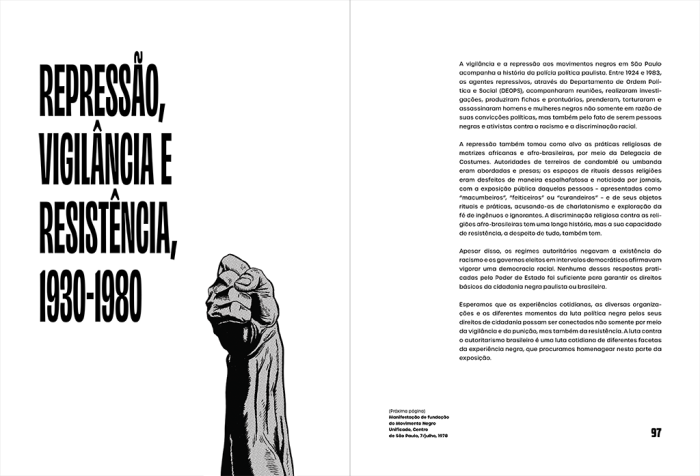 Desenhos para a Exposição “Memórias do Futuro: Cidadania Negra, Antirracismo e Resistência”, que ocupou 689 m2 do Memorial da Resistência trazendo um resgate das lutas pelos direitos da população negra no estado de São Paulo do período de 1888 até os dias de hoje através de 450 materiais entre fotos, cartazes e documentos e a participação de artistas como Bruno Baptistelli, Geraldo Filme, João Pinheiro, Moisés Patrício, No Martins, Renata Felinto, Sidney Amaral, Wagner Celestino e Soberana Ziza.